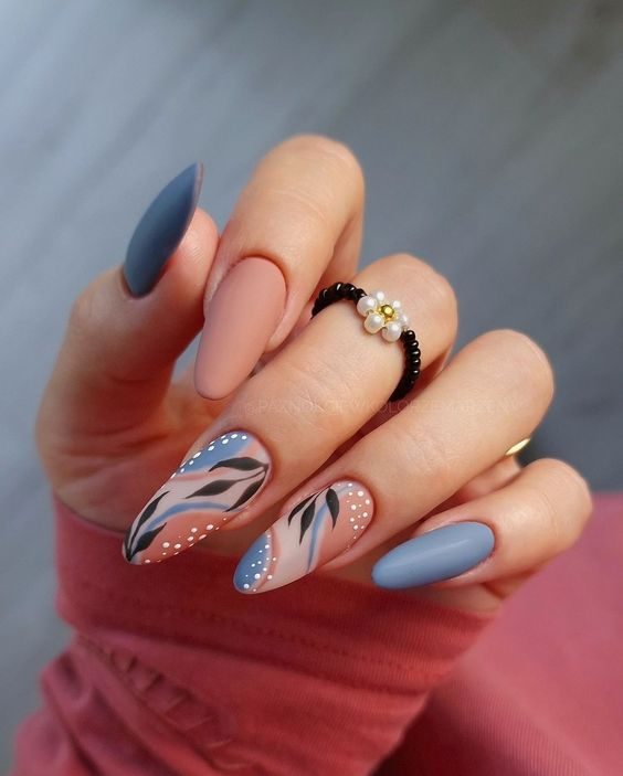 For a light, breezy aesthetic, soft pastel swirls in pink and blue offer a refreshing summer palette. Matte finish adds a modern twist, while glossy accents and dotted details add depth. This medium-length almond nail design is cute, elegant, and wearable, especially for brunch outings, summer picnics, or casual hangouts. It’s playful sophistication at its finest.