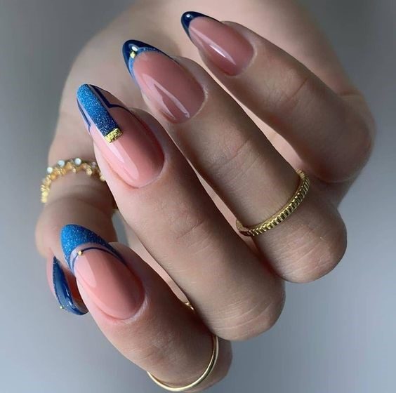 Inspired by the cosmos, this starry almond nail design features glossy nude bases with shimmering blue glitter tips and fine golden accents. The celestial theme makes it ideal for summer evenings under the stars. This design adds just the right amount of glamour to sleek jumpsuits, satin dresses, or even simple summer shorts paired with a dressy top.