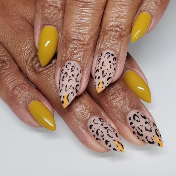 Nothing says summer like vibrant yellow, and this almond nail design infuses it with fierce energy. A bright neon base is topped with bold leopard spots, creating a wild and fun statement. This look is perfect for those who love playful patterns and want to stand out. Match it with bold colors or pair it with simple black or white to let the nails pop.