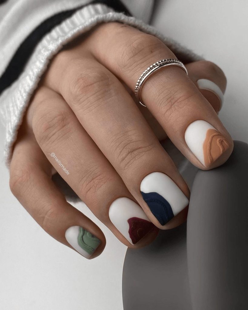 Color blocking is a stylish nod to modern art and a fun way to experiment with multiple shades in one manicure. This design uses earthy terracotta, olive, navy, and burgundy against a clean matte white base, creating a bold and creative look that’s perfect for summer holidays.