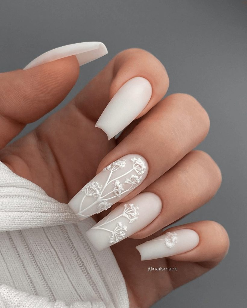 Florals aren’t just for spring—they also shine in summer when given a frosty, embossed twist. This design features white embossed flowers over a sheer base, creating a delicate and dreamy manicure that feels cool and refreshing.