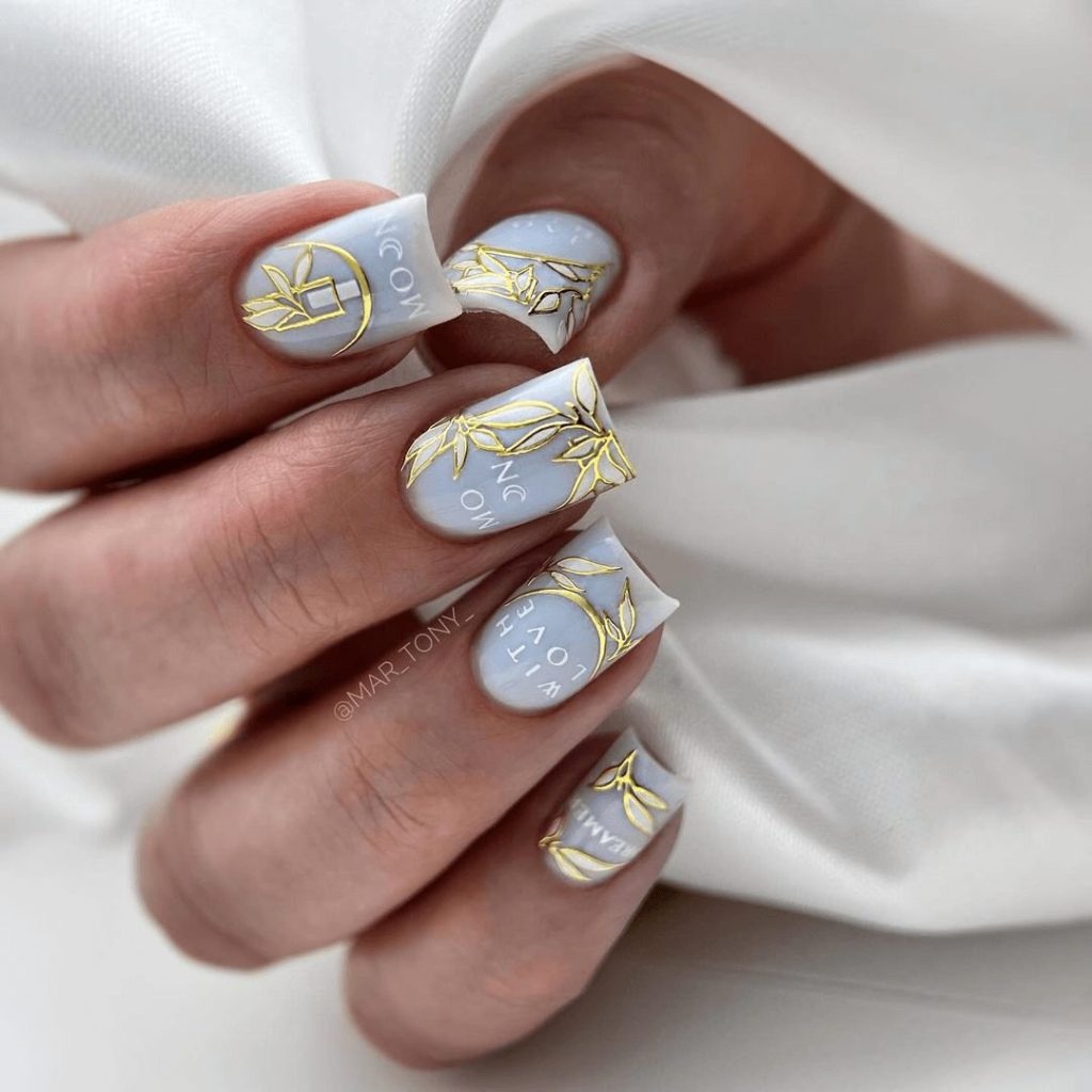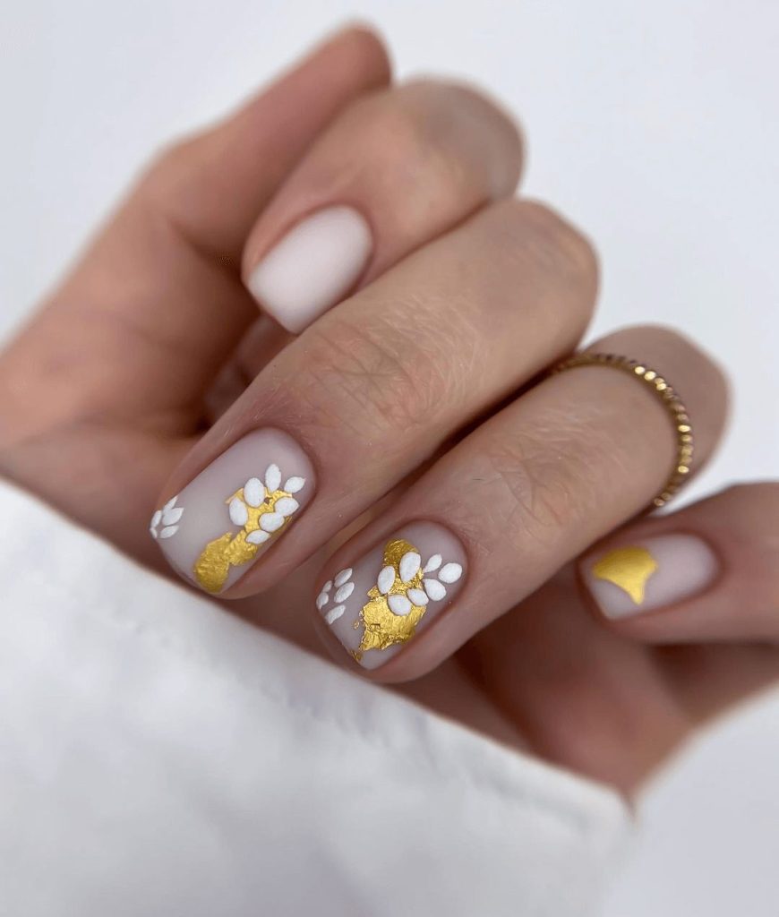 Floral designs with gold accents are always in style, and this manicure is a beautiful example of how nature and luxury can meet. White floral outlines on a nude base come alive when paired with touches of shimmering gold foil.