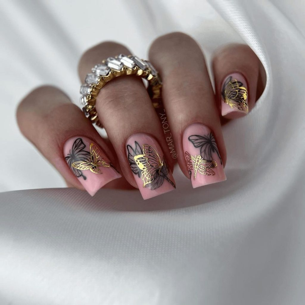 Blush pink nails with butterfly motifs bring a playful yet refined vibe to your summer vacation look. The delicate butterflies symbolize freedom and lightness, making this design perfect for capturing the joy of warm-weather adventures. The soft pink base adds romance, while the gold detailing adds elegance.
