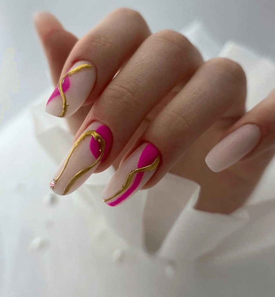 To recreate this look, start with a fuchsia acrylic base and add thin lines of gold striping tape for a sleek finish. The gold detailing elevates the look from playful to classy, making it versatile enough for both daytime fun and evening glamour. Pair these nails with gold jewelry to tie the whole look together.