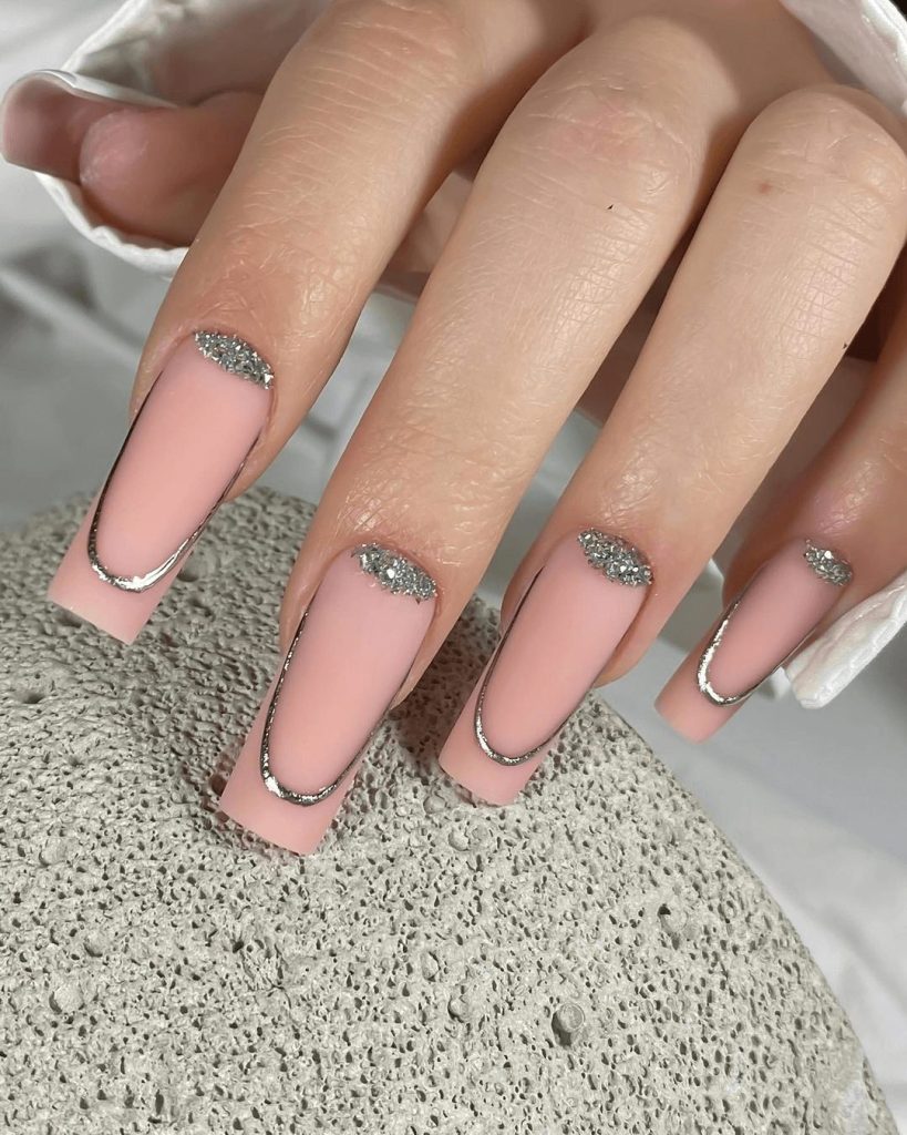 Start with a nude gel base and add a strip of silver glitter along the tip. The result is elegant, playful, and versatile enough for both daytime and evening wear. It’s a great way to modernize a classic look while keeping it simple.