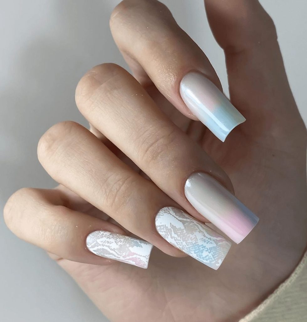 This look can be achieved with a gradient gel base, topped with lace stickers or hand-painted lace designs. A matte topcoat enhances the soft, antique feel, making the nails ideal for weddings, garden parties, or romantic summer getaways.