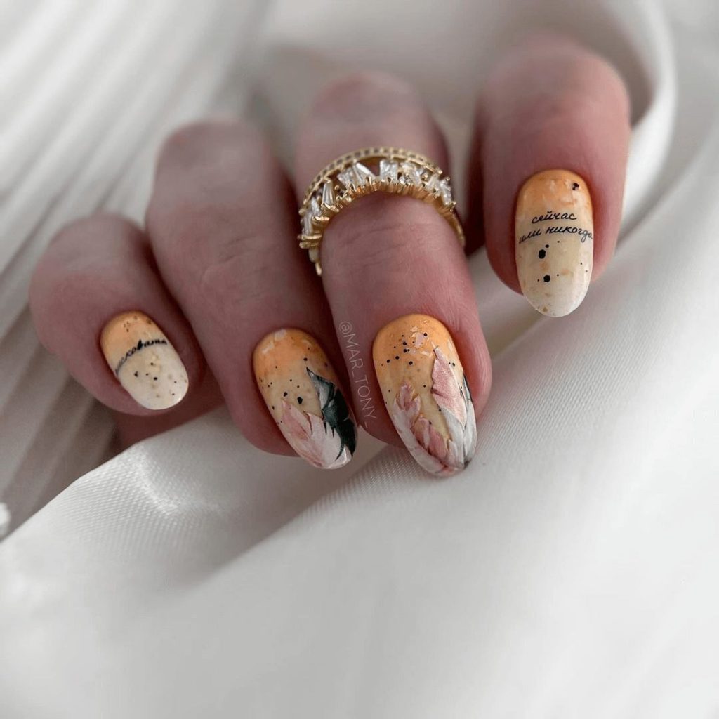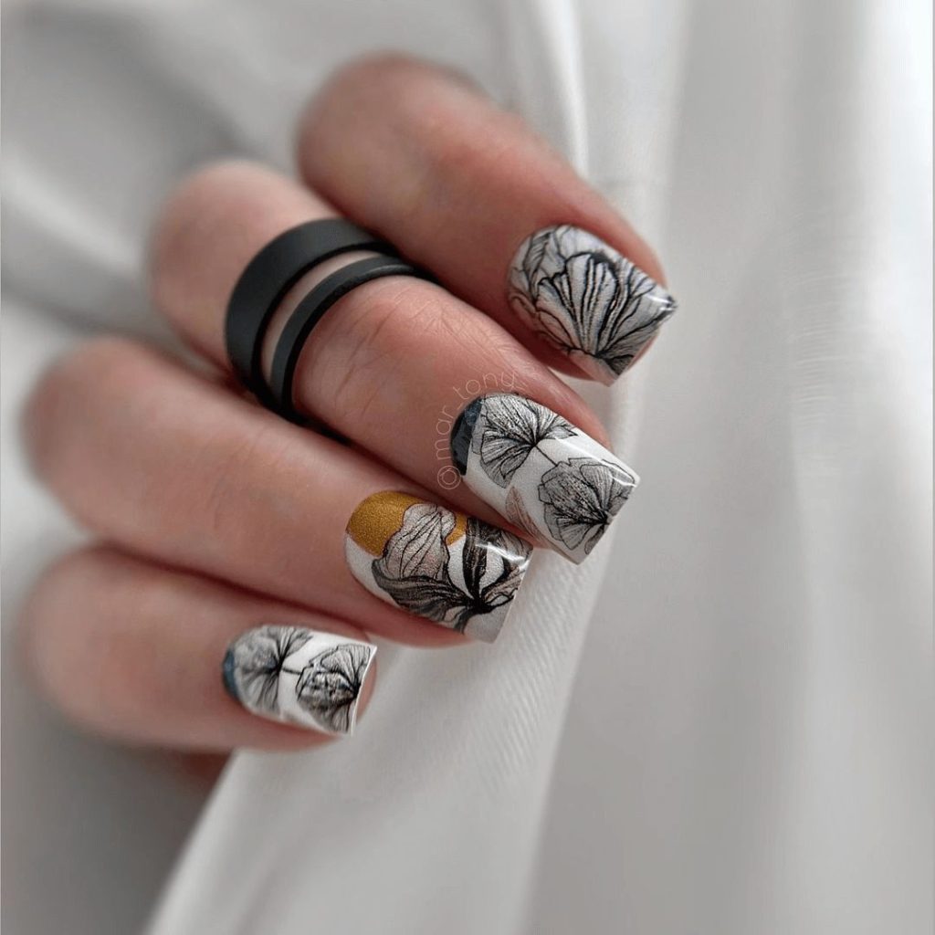 This design is a blend of bold artistry and seasonal freshness. Black floral sketches layered over a matte white base give the nails a hand-drawn feel, while a mustard accent adds warmth and vibrancy. It’s modern, edgy, and perfect for those who enjoy nail art that doubles as conversation-starting fashion.