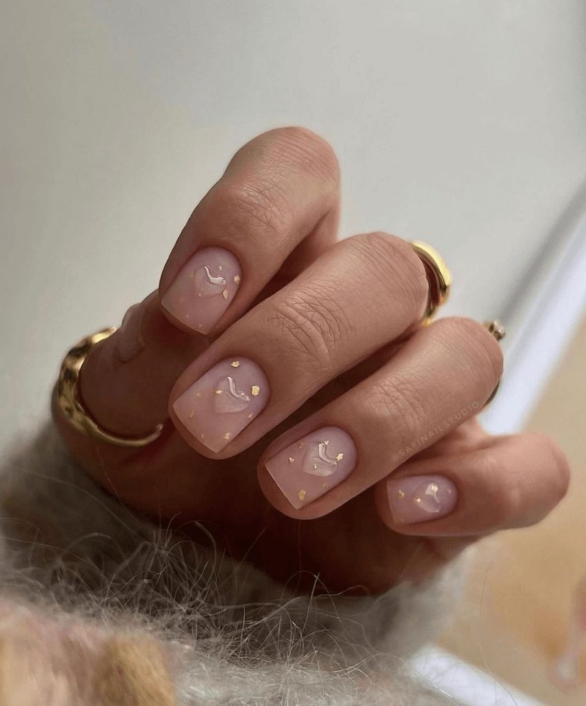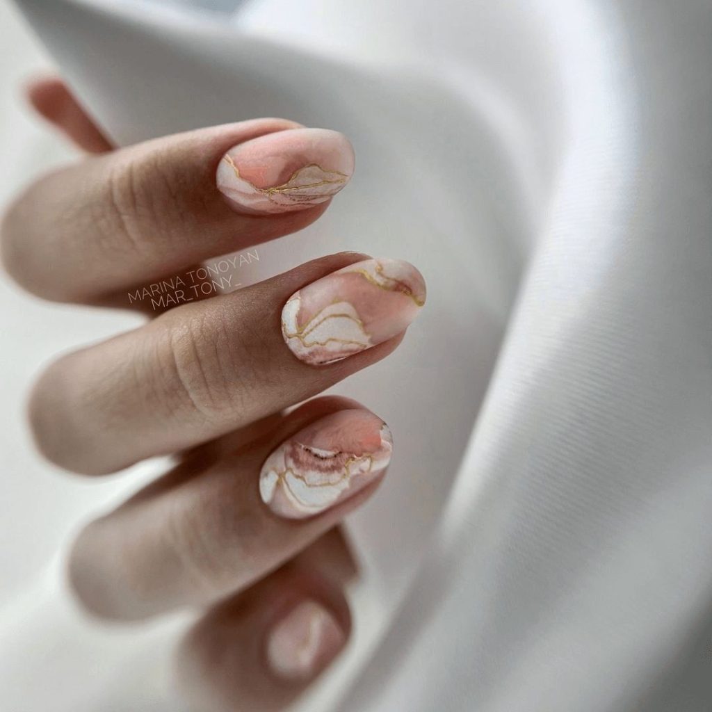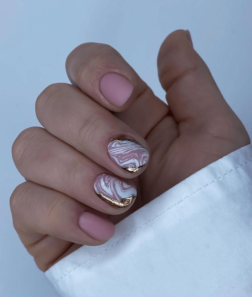 Marble nails are endlessly versatile, and this muted pink variation with white and grey swirls is as chic as it gets. Gold foil accents add just the right amount of luxury to this otherwise natural and understated look.