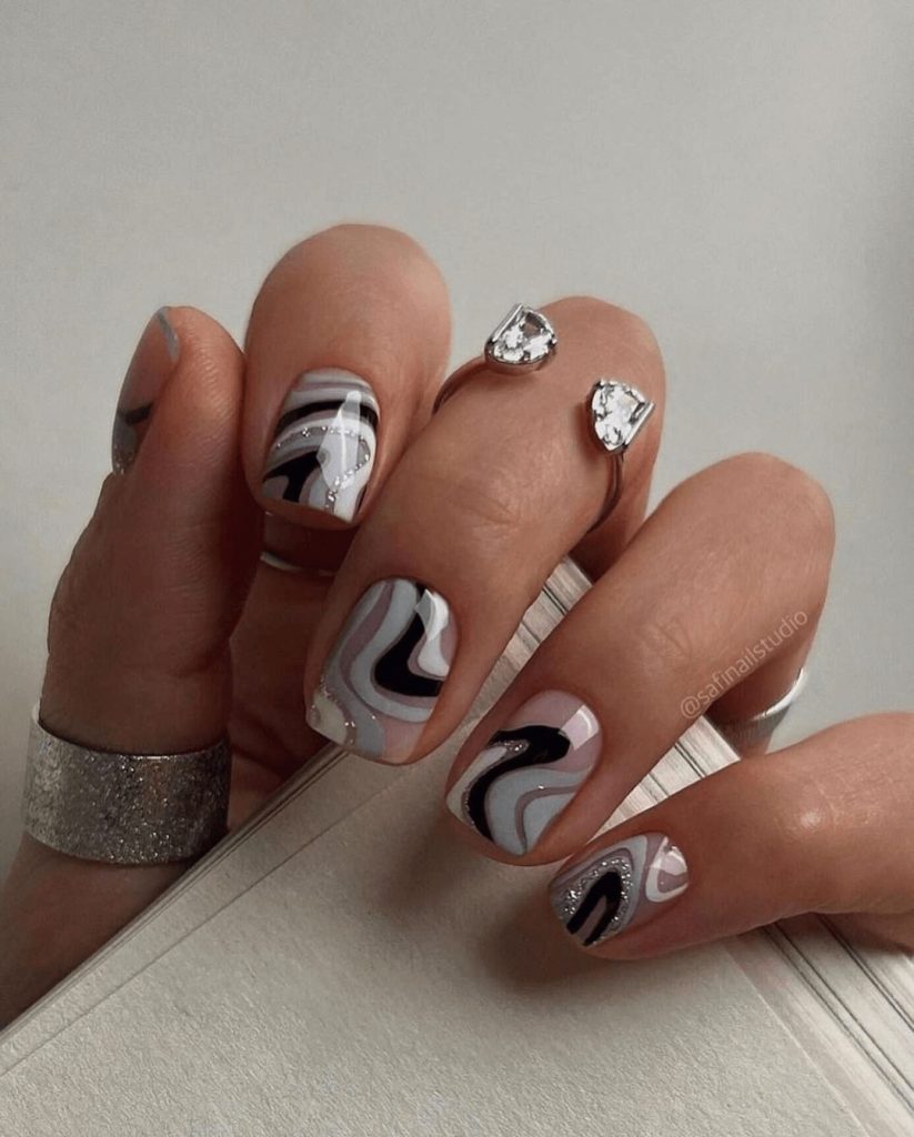 This look balances minimalism with glamour. The black and silver swirls bring depth, while the rhinestones elevate the style for special occasions. It’s ideal for anyone looking for a design that blends creativity with elegance, making it suitable for evening outings or summer galas.