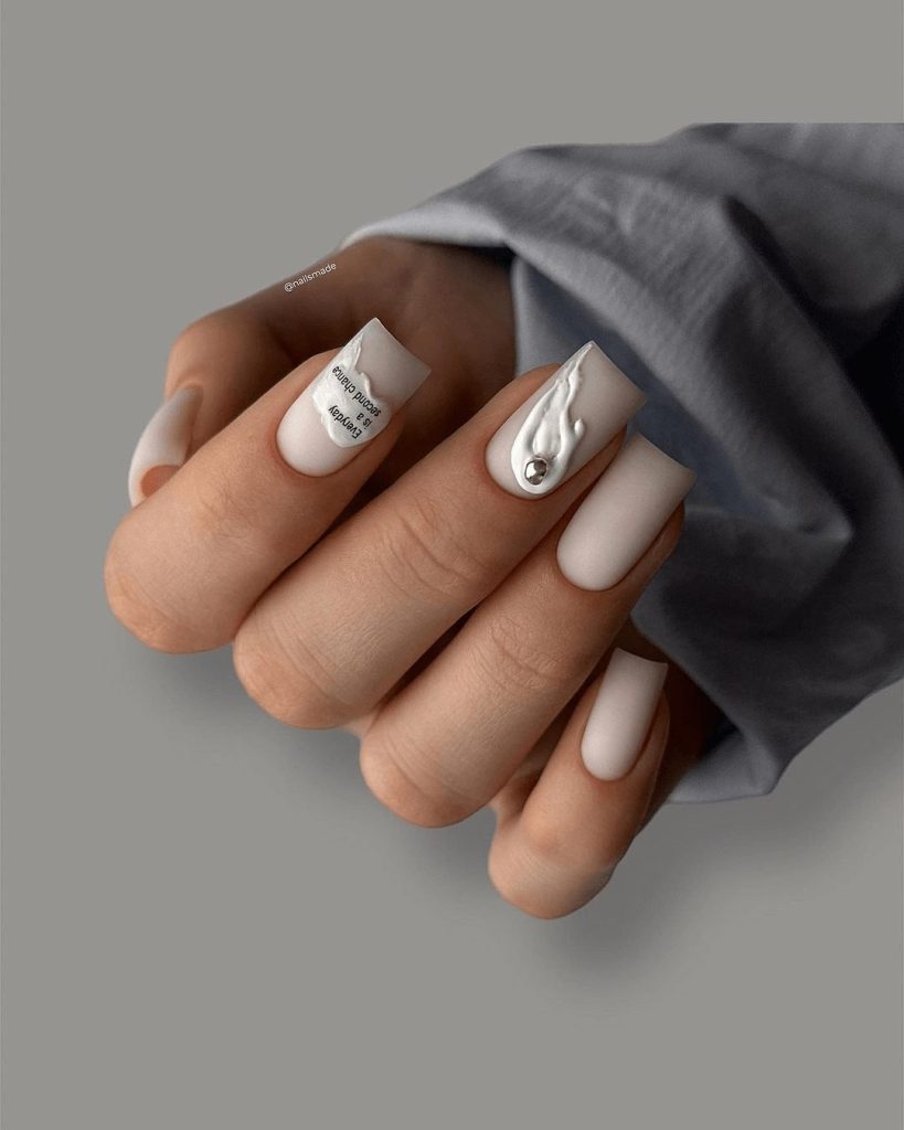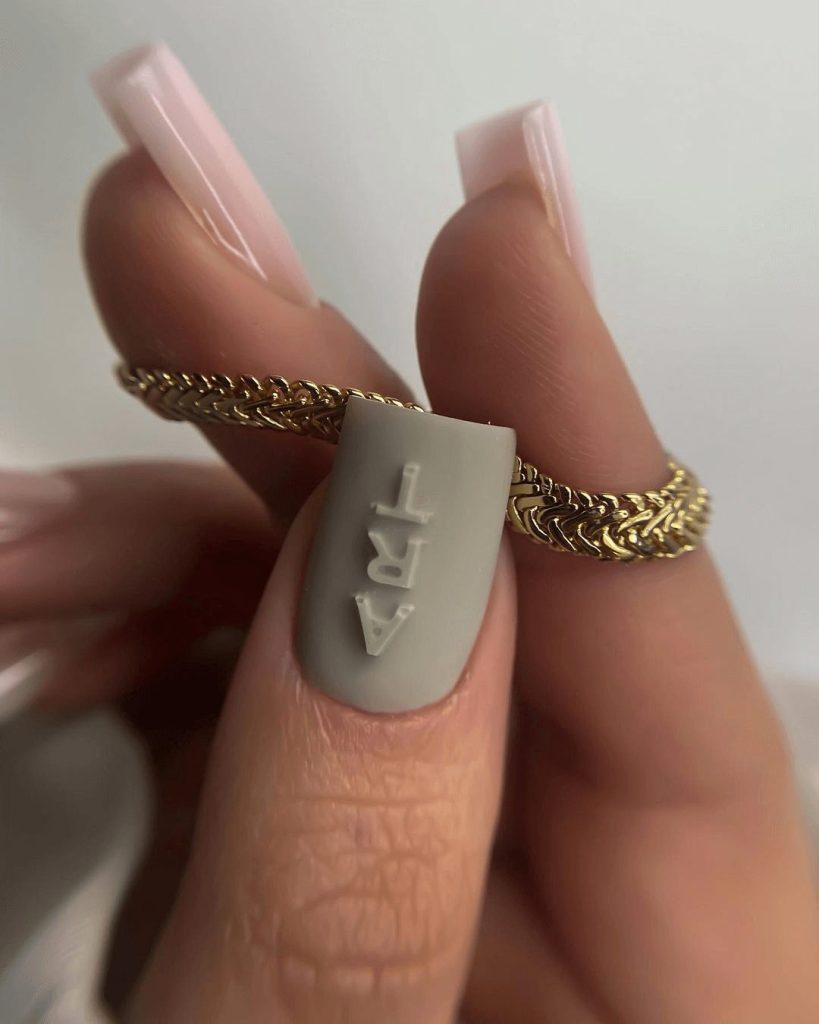 Matte grey nails with raised white typography create a design that looks straight out of an art gallery. This style is bold, modern, and perfect for those who love nail art with a creative twist.