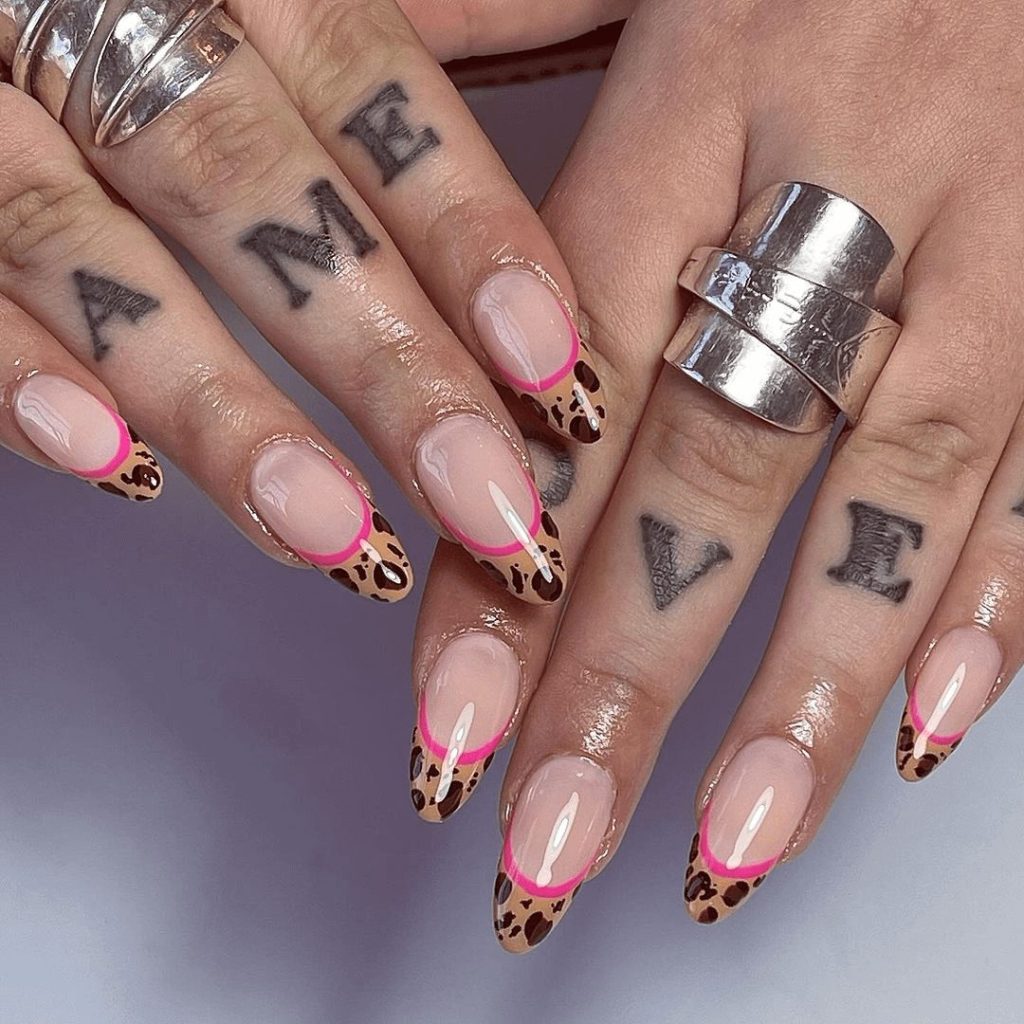 This design starts with a soft pink base, layered with spots of chocolate brown outlined in black. To make it pop even more, add neon pink accents for a modern twist. This mix of playful and daring makes the nails perfect for festivals, parties, or bold beach looks.