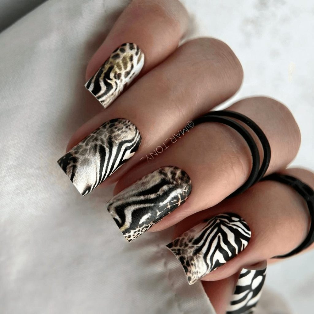To achieve this look, start with a white acrylic base and carefully hand-paint animal patterns in black. A high-gloss topcoat finishes the style, giving it a sleek, polished appearance. Pair these nails with neutral-toned outfits for a sophisticated safari vibe, or let them pop against bright summer colors.