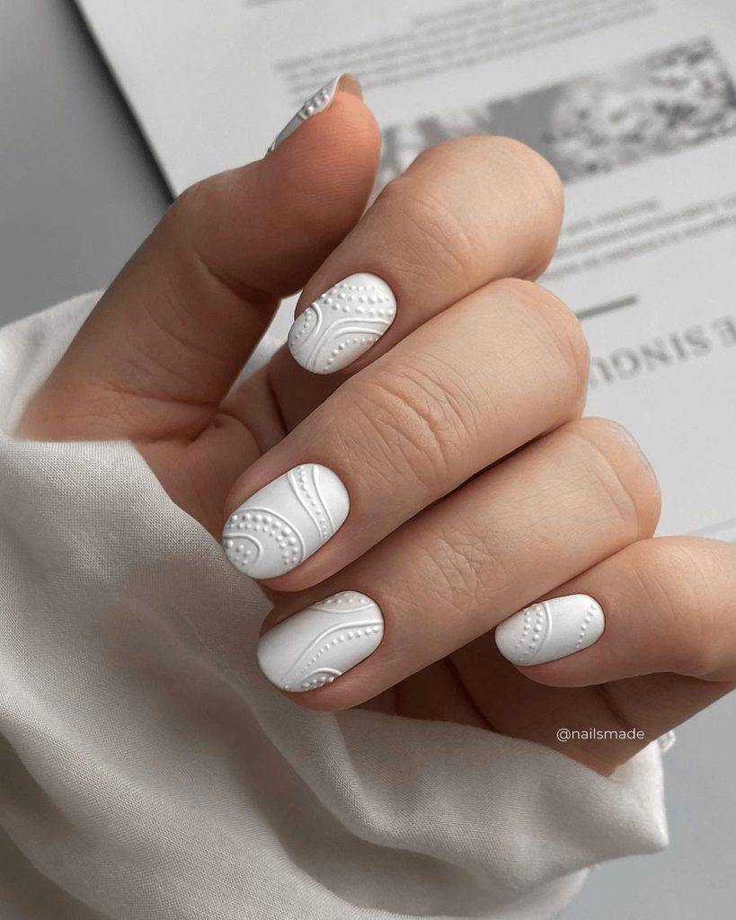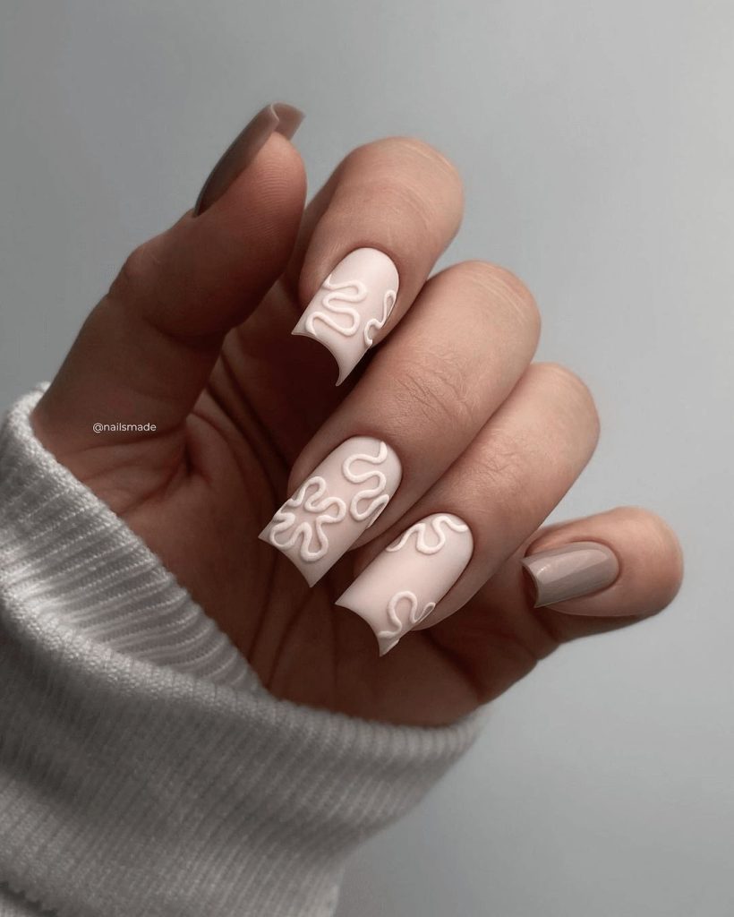 Neutral nails don’t have to be plain, and this design proves it by adding raised sculpted patterns to a nude base. The tactile, three-dimensional effect brings depth and uniqueness, transforming a simple manicure into a work of art.