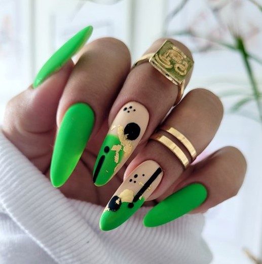 Bold, artsy, and totally modern—these long acrylic nails feature abstract green shapes, golden accents, and striking contrast. This design brings together fashion and fine art, making it the perfect choice for those who want a creative, conversation-starting manicure. It’s aesthetic, fashionable, and perfectly aligned with 2025’s bold nail trends.
