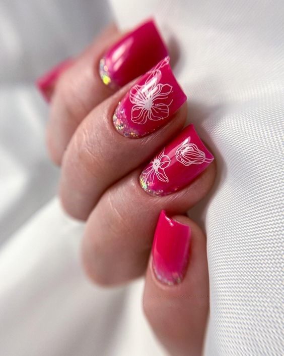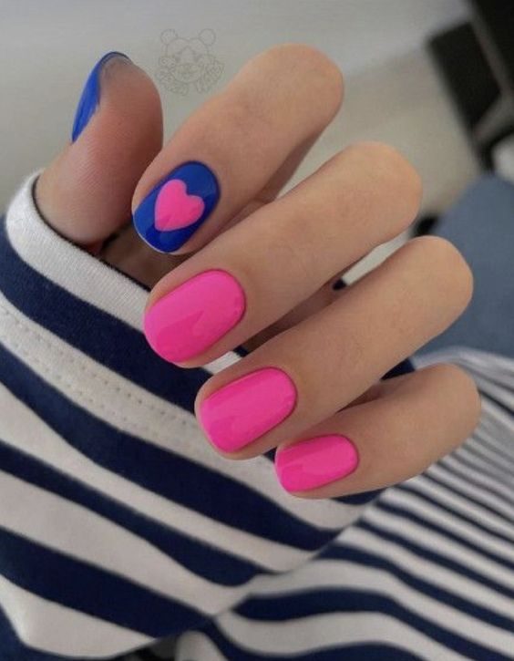 Neon pink makes a retro revival in this fun, nostalgic nail trend. Medium-length acrylics are drenched in vibrant pink, with feature nails showcasing pastel heart art inspired by ‘80s diners and disco days. This look is made for those who embrace their inner baddie while still keeping it pretty. It’s a confident, expressive design for bold summer personalities who love to stand out.