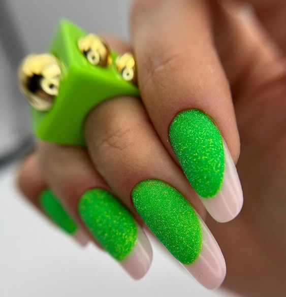 Celebrate the richness of summer foliage with green glitter acrylics that sparkle like morning dew. These long, almond-shaped nails are high-impact and luxurious, ideal for parties, summer nights, or whenever you’re in the mood to shine. They add drama and elegance, especially when paired with metallic or jewel-toned fashion.