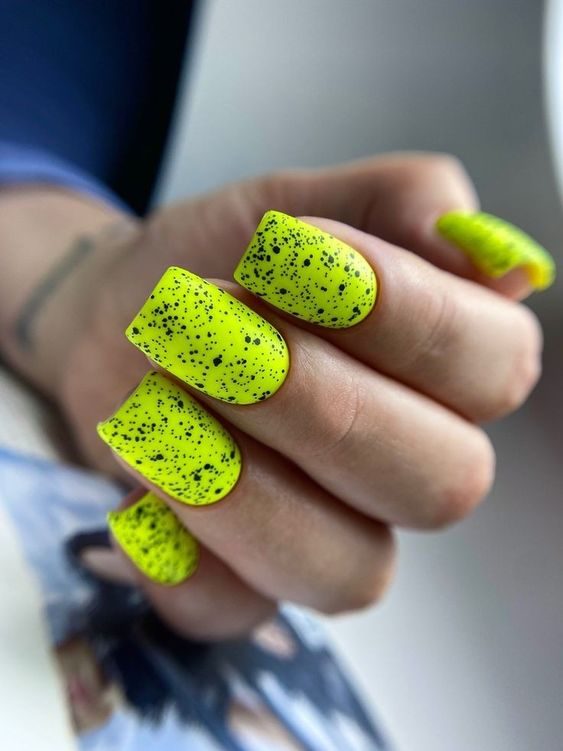 Neon yellow never fails to turn heads, and this design amplifies the effect with bold black speckles. These long acrylics are perfect for anyone embracing the vibrant energy of 2025’s color trends. Fun, daring, and totally hot girl summer-approved, these nails are your seasonal go-to for statement-making style.