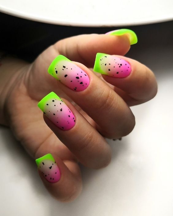 These medium acrylics offer a soft pink gradient that transitions into neon-tipped perfection. With added speckles for dimension, the design is cute, colorful, and full of personality. It’s the perfect match for warm summer sunsets and sweet vacation moments—pair with candy-colored outfits and fun accessories.