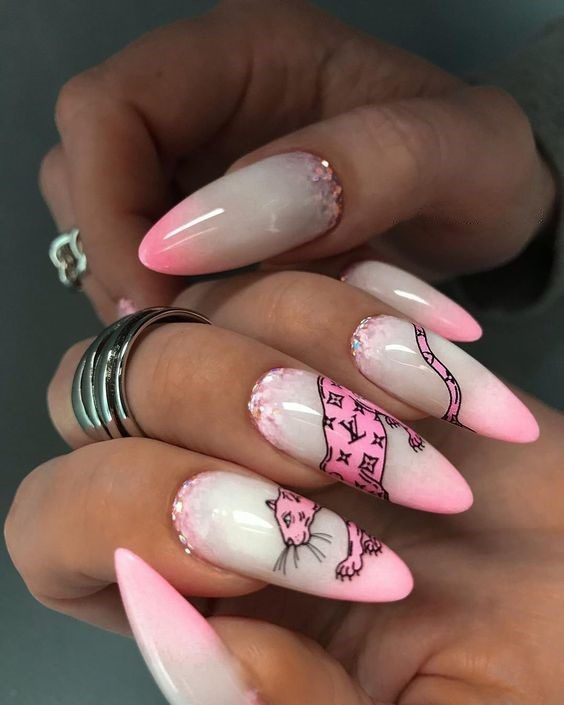 Soft pink almond-shaped acrylics take on new life with subtle sparkle and adorable hand-drawn cats. Perfect for animal lovers with a love for cute, fashionable details, this design offers a dose of charm without sacrificing style. Whether you’re out shopping or on a casual date, these nails add a whimsical touch to any look.