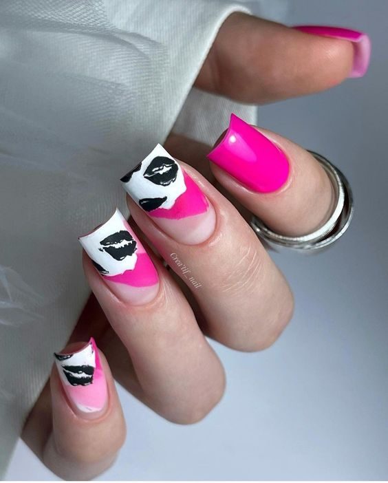 Go bold or go home with these pop art-inspired acrylics. Hot pink nails set the stage for striking black-and-white faces, offering a creative, expressive twist. This statement-making design screams personality and attitude, combining artsy edge with fashionable energy. It’s the ultimate baddie nail design for art lovers and fearless trendsetters.