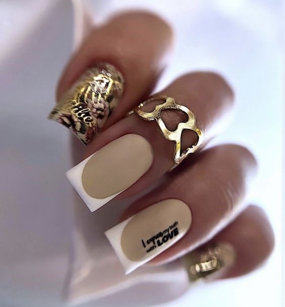 Channel the spirit of the southwest with long, white matte acrylics accented by gold designs that mimic tooled leather and cowboy flair. These western-inspired nails evoke modern cowgirl glam—perfectly complemented by stacked rings and earthy tones. It’s a stylish fusion of rustic and refined, ideal for those who want to add a touch of prairie fashion to their summer.