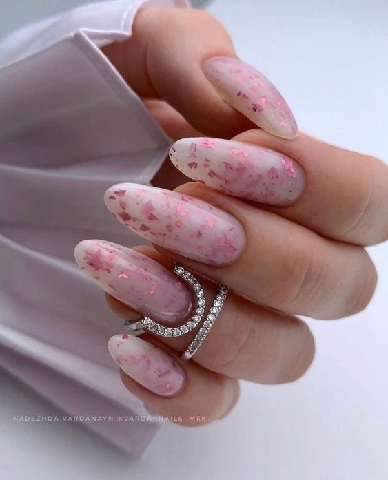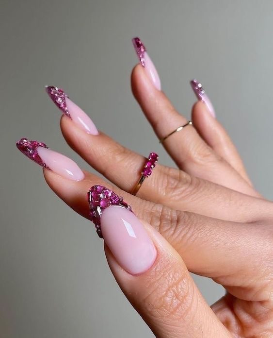 Pink nails that fade into a glittering gold cascade bring a touch of starlight to your manicure. Ideal for special evenings or stylish summer dinners, this design is a go-to for women seeking a classy nail with sparkle and warmth.