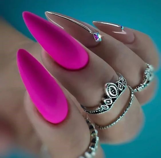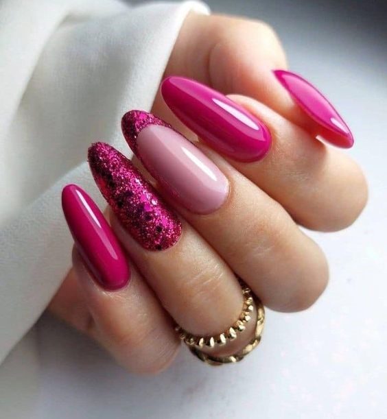Play with texture in this bold manicure that mixes matte and glossy finishes. A single glitter-accented nail provides contrast against the dark magenta and soft pinks, giving you a design that’s versatile, stylish, and ready for both day and night.