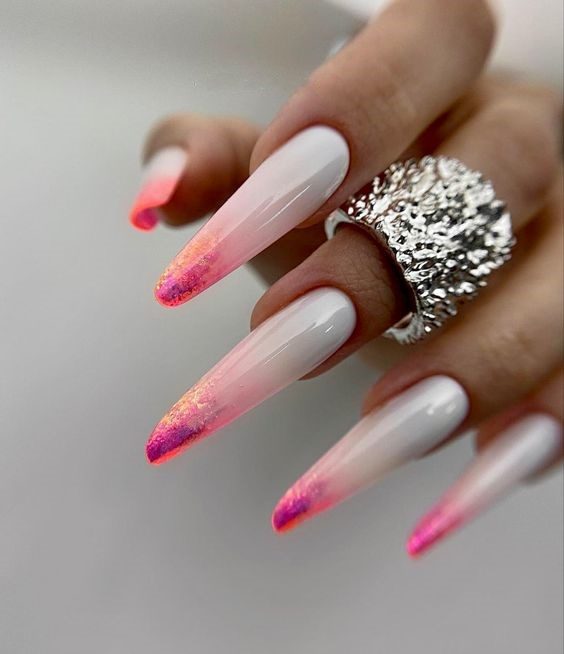 This dreamy gradient look channels the serene magic of cotton candy skies. Neon pink tips gently melt into a translucent, milky white base, offering a light and airy aesthetic. Perfect for those who love understated glam, this design strikes the balance between classy and fun, ideal for everyday wear or elegant summer evenings.