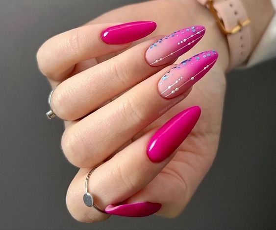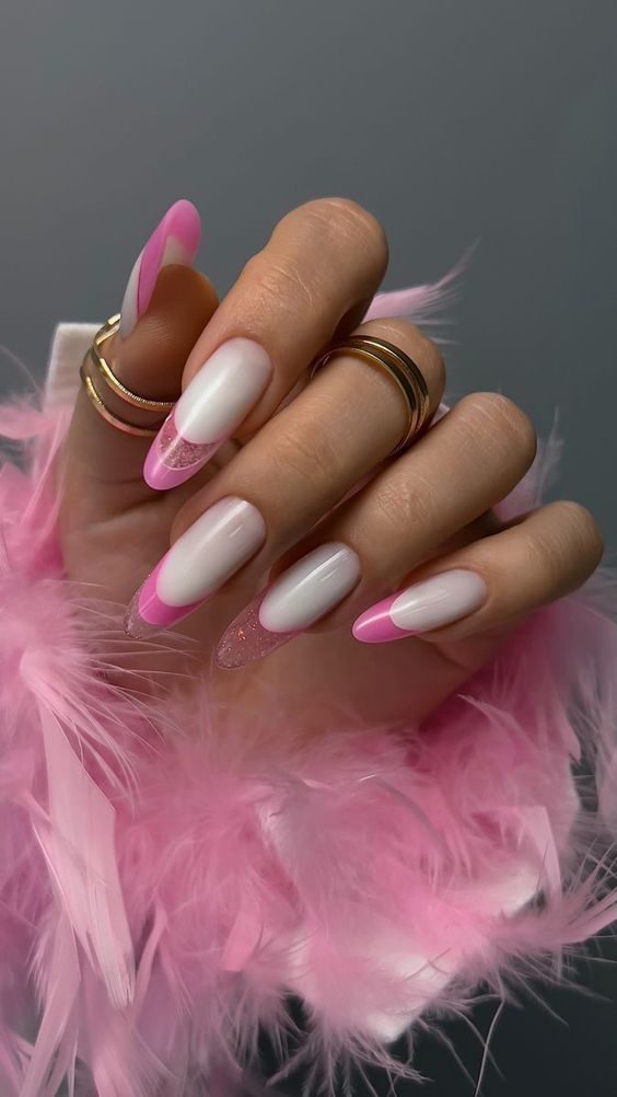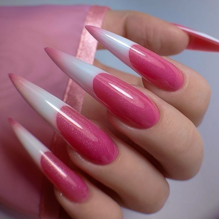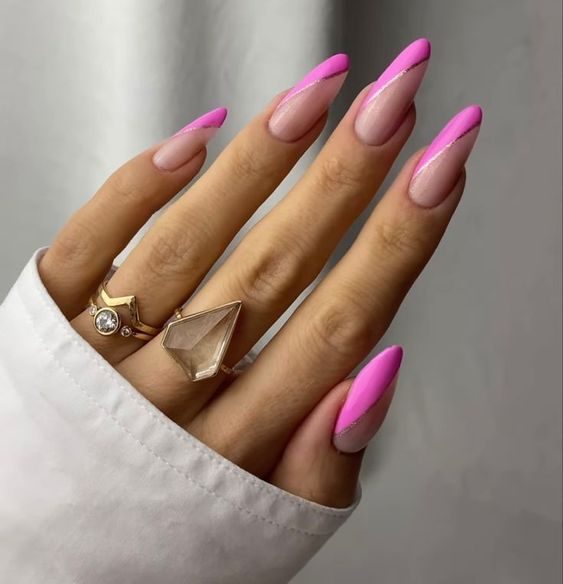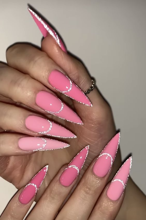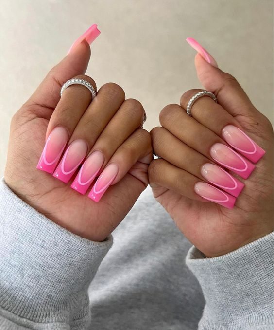 Classic meets contemporary with a French manicure that replaces the usual white with a soft pastel-to-bright pink gradient. White and silver lines accentuate the tips, offering a polished and modern look. It’s a sophisticated yet trendy option among pink summer nails 2025 for those who love a fresh take on tradition.
