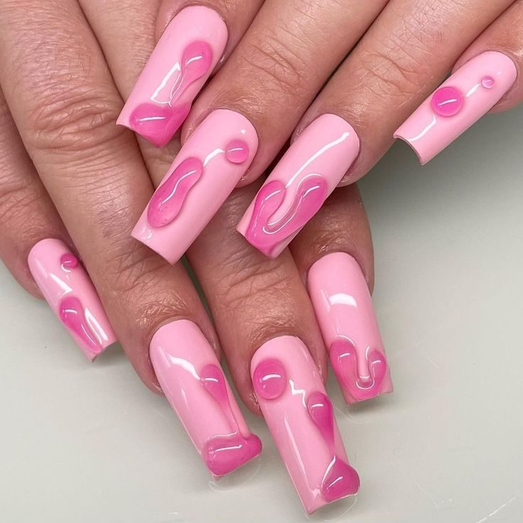 Pastel pink gets a playful upgrade with fluid, swirling patterns in bright and white tones. The textured, gel-like finish gives a sculptural effect, turning each nail into a work of art. For women who love simple yet cute pink summer nails, this design brings a natural elegance with a modern twist.