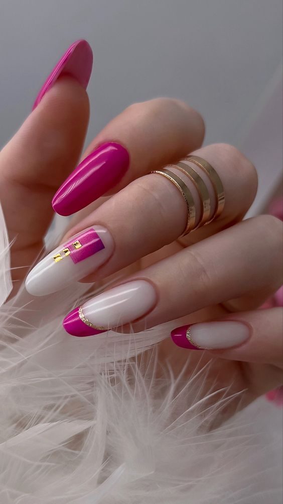 Architectural lines and sharp contrast define this chic nail art. Bright pink accents stand out over a milky pastel base, with geometric precision that adds depth and dimension. A perfect fit for the modern minimalist who appreciates classy pink nails with a bold, design-forward edge.