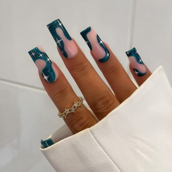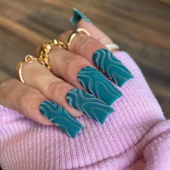 With swirling seafoam and teal, these long gel nails mimic the ocean’s rhythm. Their textured design gives a splash of personality, ideal for beach getaways or any setting that embraces coastal style and water-inspired beauty.