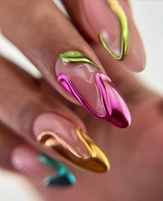 Ride the trend wave with futuristic chrome finishes that shimmer like ocean tides. These summer gel nails 2025 mix metallic greens, hot pinks, and glowing golds that shift under sunlight. Perfect for the tech-savvy fashionista, this design blends high-shine boldness with sleek elegance. Whether you’re pairing them with minimal outfits or glitzy accessories, these nails become the focal point of your summer look.