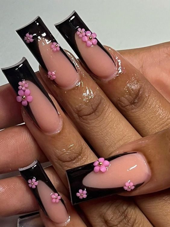 A moody contrast of glossy black tips and delicate pink floral accents gives these short square nails a dramatic flair. Feminine yet bold, they pair beautifully with elegant black dresses or edgy eveningwear.