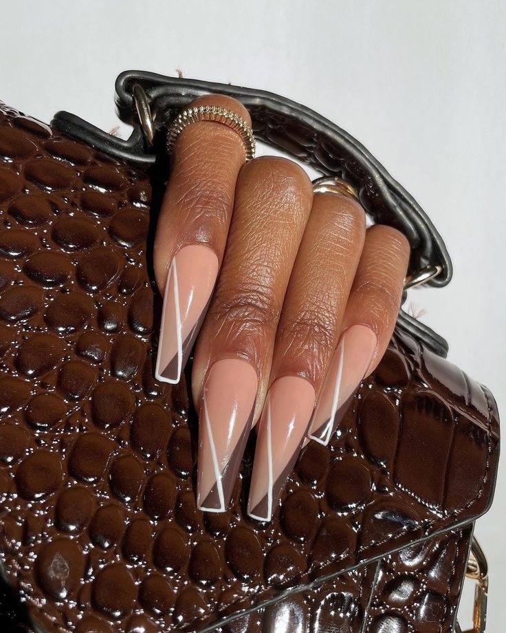 Black and nude polish meet sleek metallic accents in this modern geometric look. Minimal yet commanding, these long gel nails are a statement of high-fashion simplicity, ideal for bold dressers and trendsetters alike.