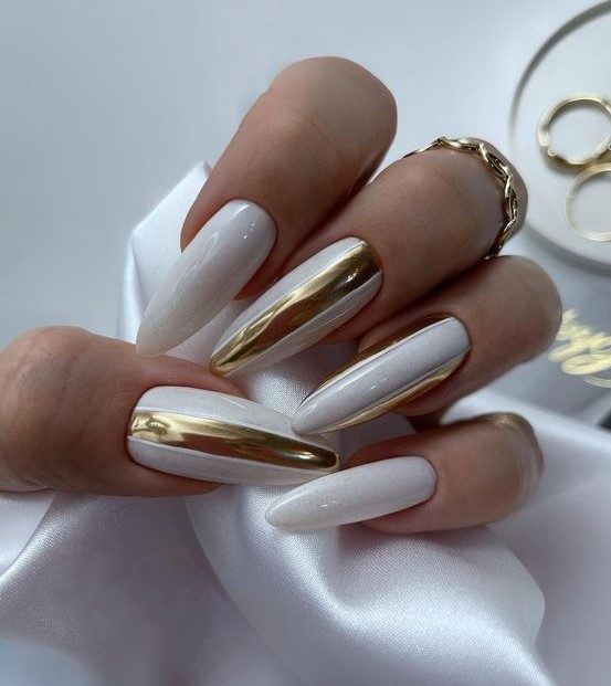 White matte polish meets rich gold shimmer in this design fit for a summer queen. These long nails radiate luxury and class, perfect for upscale events or simply elevating your everyday look with a regal touch.