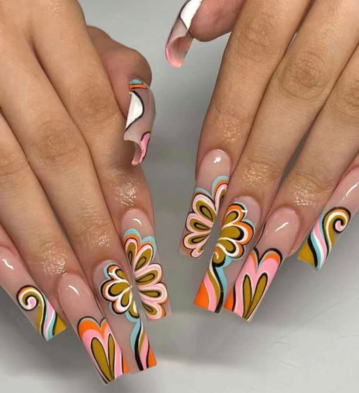 Throw it back with flower power! These long gel nails feature groovy floral patterns in oranges, yellows, and browns, evoking a 1970s summer aesthetic. They pair perfectly with boho outfits and outdoor festivals, embodying carefree energy and colorful nostalgia.