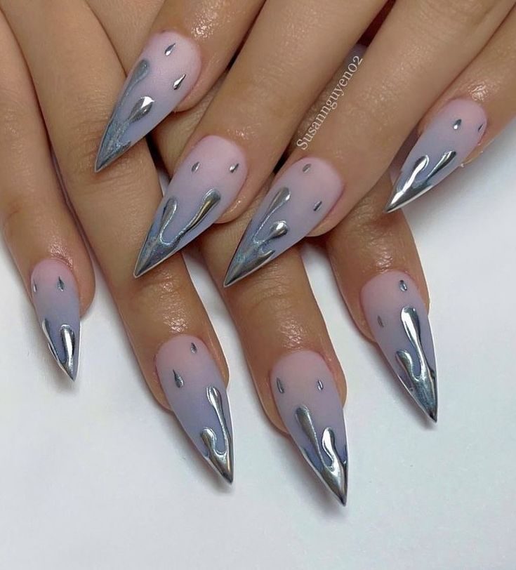 A mix of softness and edge, this look features lavender polish paired with molten silver tips. Sleek and futuristic, these almond gel nails work beautifully with metallic accessories and flowing dresses, blending femininity with sci-fi sophistication.