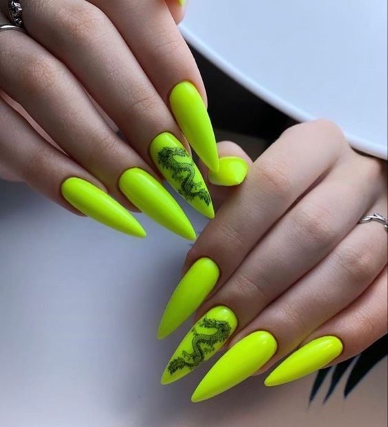 Make your fingertips glow with neon green stiletto nails accented by tropical details. These long gel nails are vibrant, edgy, and perfect for turning heads. Match them with vibrant summer prints or sleek monochrome to let the color steal the show.