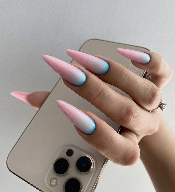 Tranquil and clean, this almond-shaped nail design features sky-blue tips over a pink base, evoking summer skies and peaceful days. It’s a calming and elegant choice for anyone who loves simplicity with impact.