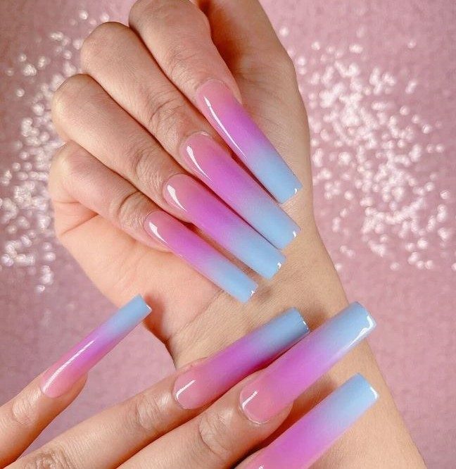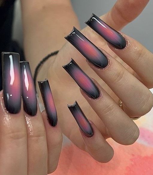 These long nails mimic a vivid summer sky, transitioning from twilight purple to glowing red. Romantic and striking, the look captures the magic of day-to-night elegance—an ideal complement to bold fashion or simple silhouettes.