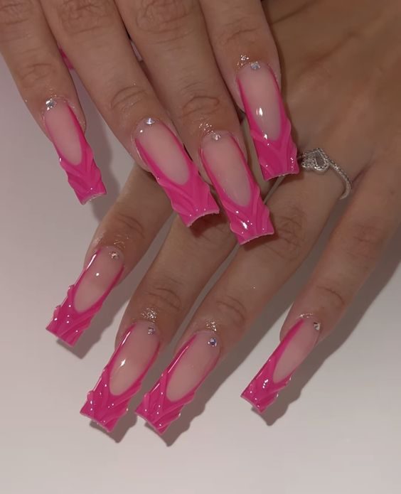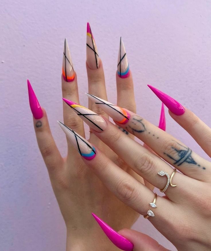 Each nail becomes a miniature canvas in this art-inspired look, combining hot pink with sweeping black strokes. Transparent bases let the design breathe, making the bold lines and shapes pop. These long gel nails turn every hand movement into a style statement.