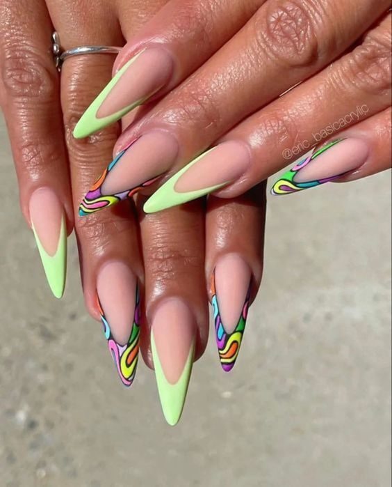 Channel retro festival vibes with swirling neon hues that dance across almond-shaped nails. Playful and hypnotic, this design brings together brightness and nostalgia, making it perfect for fun weekend looks. These summer gel nails are flirty, fun, and full of character, ideal for pairing with flowing sundresses or casual denim.