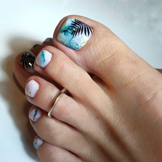For lovers of clean lines and contemporary art, monochrome abstract swirls with a hint of teal offer a uniquely stylish edge. Each toe features minimalist yet expressive designs, giving your feet a gallery-worthy appeal. This style is ideal for those who appreciate simplicity with a twist and works well with any summer outfit, from breezy beachwear to structured street style.
