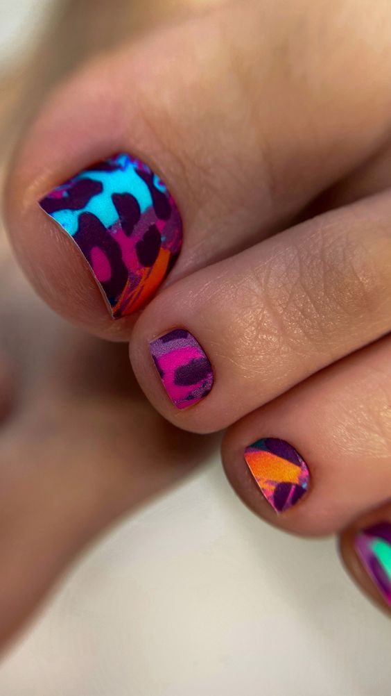 Dive into an abstract blend of blues and oranges that mimic the vibrant colors of ocean coral and summer sunsets. Every toe displays a unique splash of color, resulting in a design that feels like modern art in motion. This look is bold, creative, and packed with personality—ideal for those who love to make a style statement from head to toe.