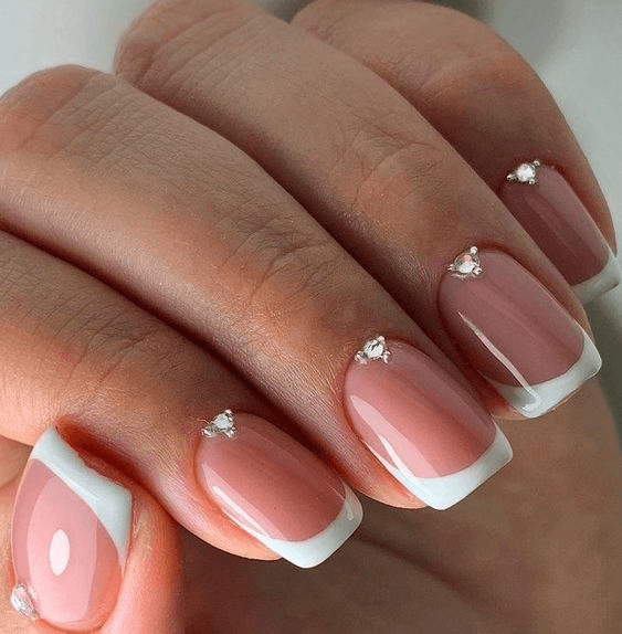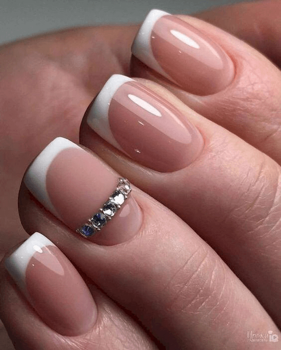 The quintessential French tip is reimagined with the simple addition of a single crystal on each nail. This look stays true to the timeless French style, maintaining a neat short square shape, but adds a hint of glamour that feels refined and chic. It’s perfect for brides who love classic elegance but crave a touch of sparkle to elevate their bridal vibe.