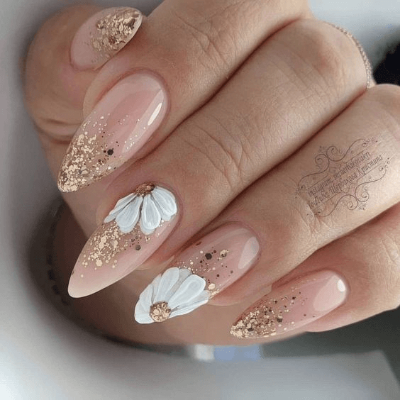 Bring an artisanal touch to your manicure with hand-painted floral accents and scattered gold leaf flecks. Long stiletto nails make a dramatic statement while the delicate details keep the look refined. It’s a beautiful choice for brides who want their nails to feel like miniature works of art that complement their floral arrangements and golden bridal jewelry.