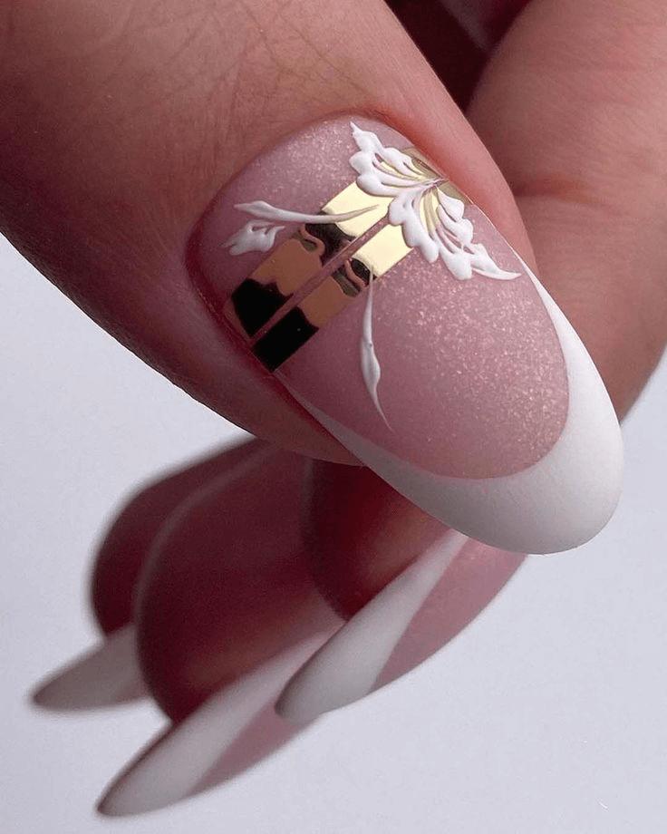 For the bride seeking a fusion of classic romance and modern detail, these white and gold nails create an exquisite floral statement. The long stiletto shape elongates the fingers, exuding confidence and drama, while the delicate gold foil petals add just the right amount of luxury. Ideal for an elegant evening affair or a grand autumn celebration, this design brings a hint of regal opulence while keeping the base clean and natural.