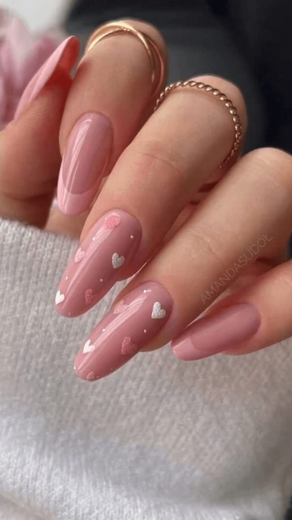 For the romantic at heart, soft pink hues and tiny glitter hearts add a playful, sweet element to your bridal nails. Medium-length almond nails provide a flattering shape that’s both feminine and practical. This look whispers love in every detail and pairs beautifully with delicate jewelry and soft, romantic florals on your big day.
