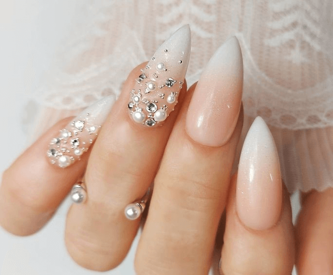 This trend blends bold modern design with delicate charm. Long stiletto nails become a canvas for sharp geometric patterns balanced by tiny pearls or pearlescent details. It’s for the bride who loves high fashion but wants her nails to feel elegant and fresh. This style works wonderfully for winter weddings or sophisticated evening receptions where light will play off each facet and pearl.